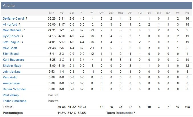 Les dernières minutes se déroulent dans une intensité qui rappelle les playoffs. Kyle Korver rentre son 4e trois-points de la partie après rebond offensif à 51.8 secondes, réduisant l’écart à trois points, 109-106. Lance Thomas rate complètement son 3-points dans le corner sur la possession suivante mais Al Horford ne parvient pas à contrôler le rebond et New York récupère le ballon. Pas longtemps puisque les Hawks interceptent et Mike Muscala colle un dunk pour revenir à un point. Tim Hardaway obtient une faute et fait 1/2 aux lancers, laissant 13.3 secondes à Atlanta. Teague obtient le shoot qu’il voulait, un floater, mais le ballon rebondit sur le cercle et Smith scelle la victoire aux lancers.