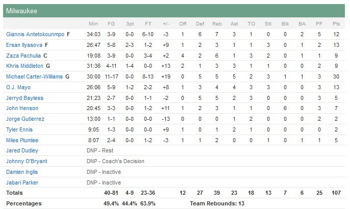 Ses coéquipiers O.J. Mayo, Ersan Ilyasova et Giannis Antetokounmpo ajoutent respectivement 13, 13 et 12 points. Privés de Nerlens Noel (cheville), les Sixers sont menés par les 25 points de Robert Covington et les 19 unités d’Hollis Thompson mais leurs 30 pertes de balles ne pouvaient pas les mener bien loin dans ce match. Rookie de l’année la saison passée, Carter-Williams tourne à 22.8 points, 3 rebonds et 6.3 passes par match sur ces 4 derniers matchs et pourra goûter aux playoffs dès cette saison, son équipe étant certaine de terminer 6e à l’Est.