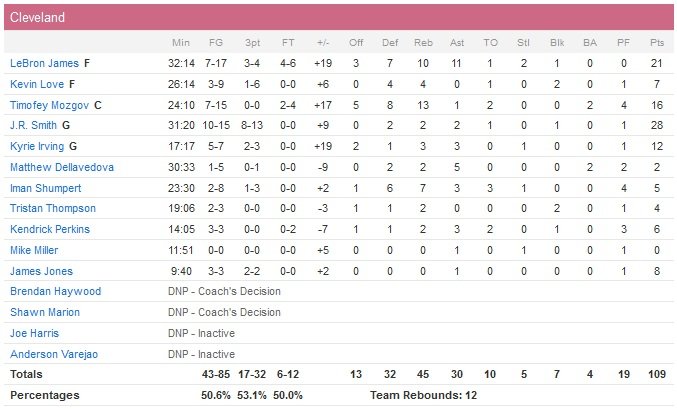 Smith et Irving participent grandement à un 16-0 en faveur des locaux dans le premier quart-temps et Cleveland prend l’avantage 23-5. Les Cavs rentrent 4 trois-points dans les 5 dernières minutes de la période pour se détacher largement 36-14 avant de jouer le deuxième quart. Detroit se bat pour revenir et se rapproche au maximum à 49-35 mais une fois les titulaires de Cleveland de retour, la sanction est lourde et le match déjà plié à la mi-temps, 62-37. James restera néanmoins sur le parquet jusqu’à ce qu’il reste 8″08 dans le quatrième, histoire d’attraper un 10e rebond.