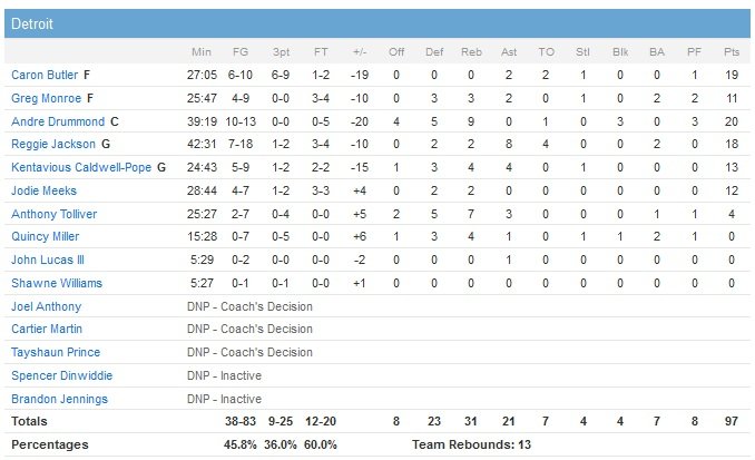 Depuis le 15 janvier, l’équipe de David Blatt compte désormais 33 victoires pour 9 défaites. J.R. Smith a complètement pris feu de loin avec 28 points à 10/15 dont 8/13 à 3-points, 2 rebonds et 2 passes. Sa performance a permis aux Cavs de devenir la 11e équipe de l’histoire à atteindre les 800 trois-points inscrits en une saison (17 tirs primés cette nuit). Également de retour, Kyrie Irving apporte 12 points en première mi-temps mais a été préservé en seconde en raison d’une raideur à la hanche droite. Les Pistons, menés de jusqu’à 26 points en première mi-temps, sont emmenés par 6 joueurs à au moins 10 points, Andre Drummond en tête avec 20 points et 9 rebonds. L’expérimenté Caron Butler ajoute 19 points.