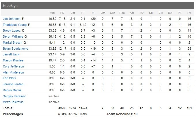 Grâce à la défaite des Pacers face à Memphis, les Nets terminent à la 8e place de la Conférence Est et affronteront Atlanta au premier tour des playoffs. Ils s’étaient imposés un peu plus tôt dans la soirée contre Orlando (25V-57D), 101-88, s’assurant une 38e victoire décisive, grâce à 28 points de Bojan Bogdnaovic (12/17). Brooklyn s’est ainsi remis d’une série de deux défaites qui aurait pu coûter cher aux hommes de Lionel Hollins.