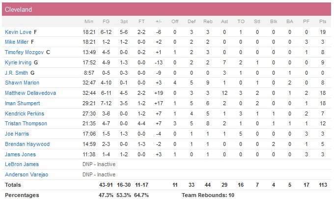 Matthew Dellavedova en profite avec 18 points et 12 passes ainsi que deux lancers importants à 9.1 secondes pour permettre à Cleveland (53V-29D) de mener 111-108 (Shawn Marion ajoutera ensuite deux points sur interception et dunk). Kevin Love inscrit 19 points avant la mi-temps et Kyrie Irving (9 points et 7 passes) ne joue pas les 29 dernières minutes du match, histoire d’être prêts pour le match 1 face aux Celtics dimanche.
