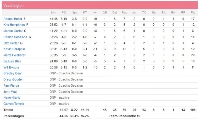 Même approche du côté des Wizards et de Randy Wittman, qui a carrément mis John Wall, Bradley Beal, Paul Pierce et Nene au repos. Marcin Gortat n’a lui joué que 14 minutes pour des Wizards (46V-36D) menés par les 20 points de Martell Webster et les 17 unités de Rasual Butler et qui joueront les Raptors, samedi. Iman Shumpert marque 18 points pour Cleveland, mené de 15 points dans le premier quart-temps et encore 79-74 avant de jouer le 4e. Mais lui et Dellavedova vont combiner pour 17 points dans les 12 dernières minutes pour aller chercher une dernière victoire au finish. À noter que Washington a perdu Otto Porter sur une entorse de la cheville dans le troisième quart.