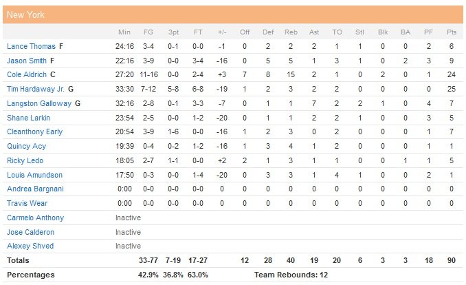 Tim Hardaway Jr termine meilleur marqueur des locaux avec 25 points, alors que Cole Aldrich bat son record en carrière avec 24 unités pour des Knicks qui ont désormais 19.9% de chances d’obtenir le premier choix de la draft en juin (ils auront au minimum le choix n°5). Le précédent record était de 21 victoires pour 59 défaites lors de la saison 1962-63. Après une égalisation à 11 partout d’Aldrich à 7″59 de la fin du premier quart, les Pistons marquent les 4 points suivants sans jamais céder. Dans ce match, Drummond rentre le premier panier du match et New York ne parviendra jamais à repasser devant. C’est encore le jeune pivot qui permet à son équipe de mener 50-35 à 4″58 de la mi-temps sur un layup. Les Knicks se rapprochent à 8 points sur deux lancers d’Hardaway à 43 secondes du buzzer (54-46) mais les hommes de Derek Fisher enchaînent avec deux de leurs 14 ballons perdus de la première mi-temps sur les deux dernières possessions du deuxième, qui se termine sur le score de 55-46.