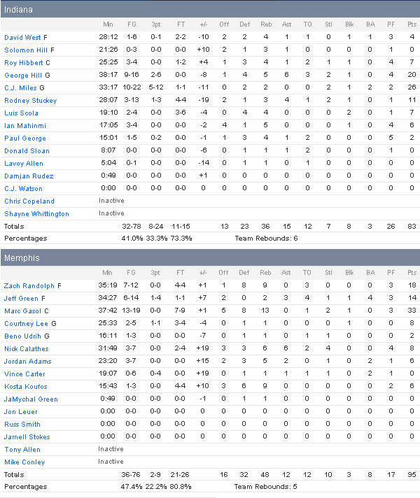 Marc Gasol a été l’homme du match en établissant son record en carrière avec 33 points à 13/19 et 13 rebonds, inarrêtable. Il a reçu l’aide de son compère Zach Randolph, qui compile 18 points et 9 rebonds alors que Jeff Green ajoute 14 points. Memphis a shooté à 47.4% et capté 16 rebonds offensifs tout en ne perdant que 12 ballons. Ajoutez à cela une défense solide pour limiter Indiana à 41% et vous avez la recette d’un bon succès. A Indiana deux joueurs ont surnagé, George Hill (20 points à 9/16 et 6 passes) et CJ Miles (26 points à 10/22) mais à leurs côtés personne n’a vraiment répondu présent. Rodney Stuckey est le seul à atteindre les 10 points avec 11 unités mais à 3/13.