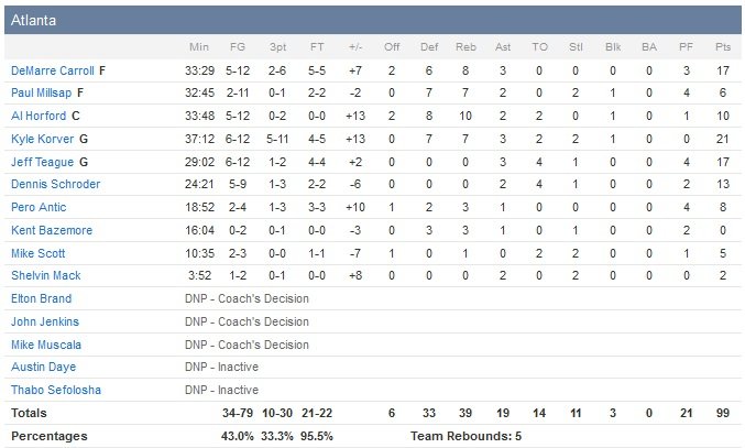 Atlanta impose un rythme rapide qui ne convient pas aux hommes de Lionel Hollins, plus à l’aise sur jeu posé en demi-terrain. Après à peine 7 minutes de jeu, les Hawks passent déjà la barre des 10 points d’écart, qui va se maintenir jusqu’à la pause (55-45). Profitant de son avantage de taille, Brooklyn démarre son troisième quart-temps sur un 9-2 pour revenir à 57-54, provoquant un temps-mort énervé de Budenholzer.
