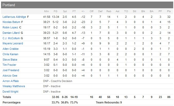 Zach Randolph (16 points à 6/19 et 11 rebonds) et Marc Gasol (15 points à 7/16, 11 rebonds et 3 contres) font très bien le boulot à l’intérieur alors que Mike Conley (16 points à 6/11) n’a même pas à jouer le quatrième quart-temps. LaMarcus Aldridge (32 points, 14 rebonds et 4 contres) a lui pris le match à son compte du côté des Blazers avec pas moins de 34 shoots tentés pour 13 réussis. Damian Lillard s’est lui compliqué la tâche avec un pourcentage faible (5/21) et termine à 14 points à 0/6 derrière la ligne. Nicolas Batum signe 15 points à 5/12, 7 rebonds et 4 passes.