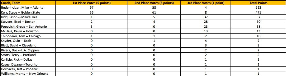 Ce n’est pas une surprise puisqu’il a mené Atlanta à la première place de la conférence EST alors que cela n’était pas vraiment attendu. Ils ont surtout affiché un superbe bilan de 60-22, le second de la ligue. Toutefois c’était très serré puisqu’il obtient 67 places de numéro 1 contre 56 à Steve Kerr pour un total de 513 points à 471 face au coach des Warriors. Kidd est lui très loin, juste devant Brad Stevens.