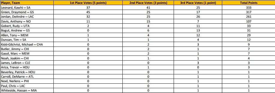 Le titre de défenseur de l’année était un des plus indécis et la ligue vient d’année que c’est le Spur Kawhi Leonard qui est élu, plutôt rare pour un extérieur. Il a terminé meilleur intercepteur de la ligue avec 2.3 interceptions par match en plus de 0.8 contre et 7.2 rebonds en 31.8 minutes. C’est son second titre individuel après son titre de MVP des dernières finales.
