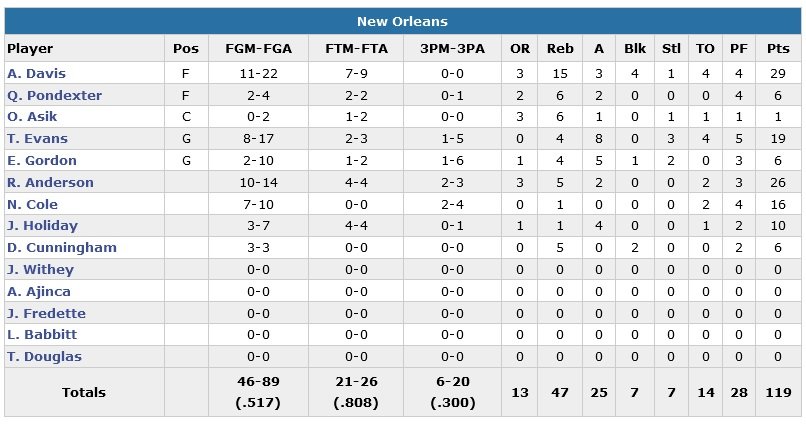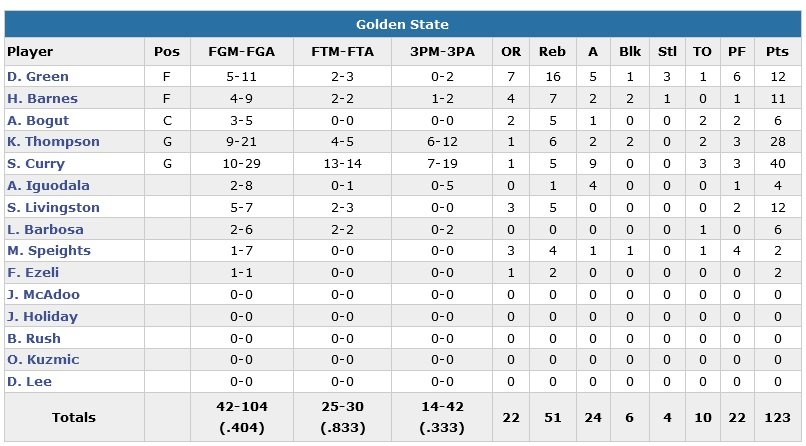 Sonnés, les Pelicans encaissent d’entrée un nouveau 3-points de Curry (111-108). Un 11-5 plus tard et après un dunk de Bogut, Golden State entrevoit la victoire alors qu’il reste 1″51 et qu’ils sont devant 119-113. Mais Evans réussit un layup et Ryan Anderson rentre un gros 3-points pour revenir à 119-118, relançant à nouveau complètement le match à 1″11. Davis aura une chance d’égaliser dans les dernières secondes de la prolongation mais Andrew Bogut le force à prendre un shoot difficile, qu’il manque complètement. Au petit jeu des lancers-francs, Golden State sort finalement vainqueur grâce à l’écart creusé en début de période et au sang-froid de son meneur , plus que jamais au sommet de son art.