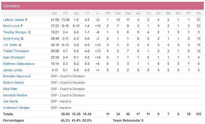 Après trois quarts-temps, David Blatt et ses joueurs sont devant 84-76. James continue d’essayer d’enfoncer le clou avec les 7 premiers points du quatrième quart (89-78) puis va distribuer un caviar à Tristan Thompson (12 points et 7 rebonds) sur alley oop. Les Celtics n’abandonnent pas et imposent un 14-6 aux Cavs, qui ne comptent plus que trois points d’avance 95-92 après un 3-points d’Evan Turner à 2″45 du buzzer. Love va finalement rassurer les siens dans le money time avec deux 3-points dont un servi par James qui fait passer le score à 101-93 alors que l’horloge affichait 26 secondes à jouer.