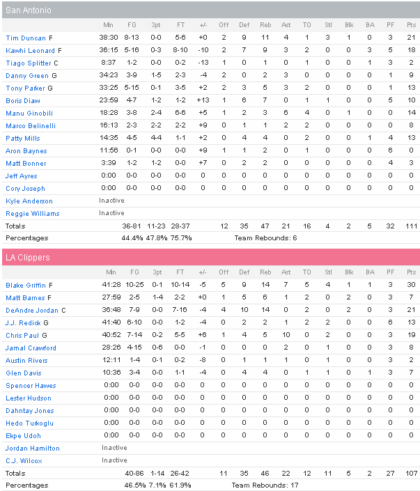 6 Texans atteignent la barre des 10 points et chacun y est allé de son action décisive. Tim Duncan a notamment réalisé un contre clutch et il termine avec 21 points à 8/13, 11 rebonds, 4 passes et 3 interceptions. Kawhi Leonard n’a pas été aussi en vue avec 18 points à 5/16 et 9 rebonds mais ça a été compensé par l’apport du banc des Spurs avec d’abord Patty Mills, brillant en première mi-temps avec 13 points à 4/4 à trois points, Manu Ginobili qui ajoute 14 points et surtout Boris Diaw (10 points et 7 rebonds) auteur de shoots très importants dans le money time. Tony Parker a lui manqué de réussite (13 points à 5/15) tout comme Danny Green (9 points à 3/9). San Antonio a construit son succès sur son adresse à trois points avec un 11/23 dont 10/14 du banc pour compenser leurs 16 ballons perdus. Les Clippers ont shooté eux à 1/14 derrière l’arc et à 26/42 aux lancers. Blake Griffin, excellent en première mi-temps avec 21 points, a été parfaitement contenu en seconde mi-temps avec seulement 9 points à 3/15 aux tirs pour un total de 30 points , 14 rebonds, 7 passes, 4 interceptions et 5 ballons perdus. Chris Paul n’a pas eu autant d’impact que lors du game 4 et il termine avec 19 points à 7/14 et 10 passes. DeAndre Jordan ajoute lui 21 points à 7/9 mais 7/16 aux lancers et 14 rebonds. Le banc des Clippers est dominé 41 à 17 .