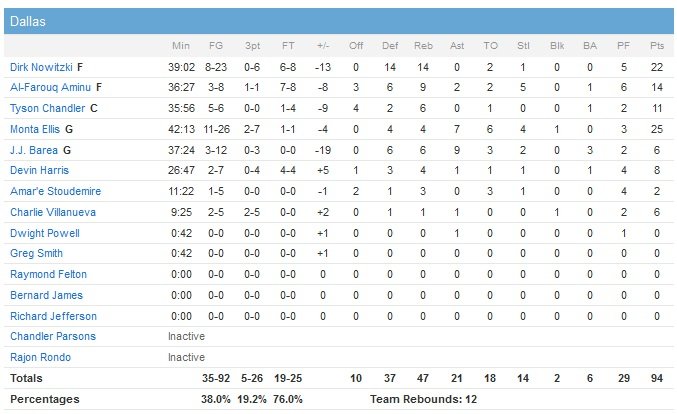 L’équipe de Kevin McHale rejoindra donc les demi-finales de Conférence pour la première fois depuis 2009. Ils rencontreront le vainqueur de la série entre San Antonio et Los Angeles. En face les Mavericks ont signé un petit match avec une adresse catastrophique de près comme de loin (38% et 5/26 à 3-points soit 19.2% de réussite contre 45.1% et 10/21 de loin pour leurs adversaires soit 32.3%). Monta Ellis (11/26, 4 rebonds, 7 passes, 4 interceptions et 6 ballons perdus) et Dirk Nowitzki (8/23, 14 rebonds) sont les meilleurs marqueurs de Dallas avec respectivement 25 et 22 points .
