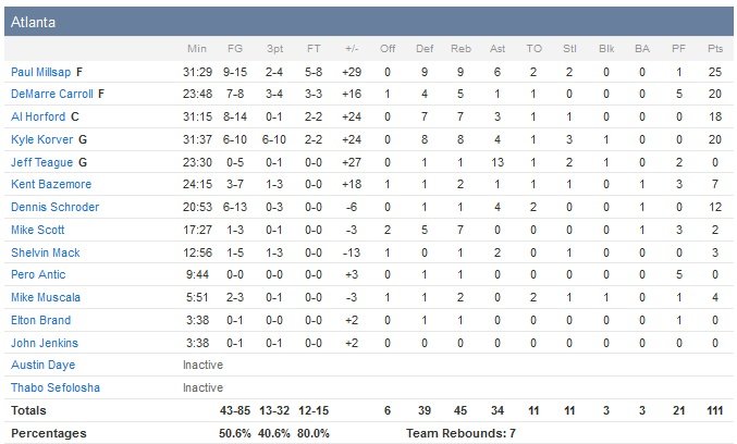Fait plutôt rare pour cette équipe basée avant tout sur le collectif, trois joueurs des Hawks atteignent ou dépassent la barre des 20 points dans cette rencontre. Paul Millsap avec 25 points (9/15), 9 rebonds et 6 passes, Kyle Korver (20 points à 6/10 uniquement à 3-points, 8 rebonds et 4 passes), qui avec son 3/3 à 3-points dans le troisième quart a transformé une avance de 6 points en un blowout pour le reste du match et DeMarre Carroll (20 points à 7/8 et 5 rebonds, 4e match d’affilée à au moins 20 pts). Jeff Teague a lui laissé son empreinte sur le match sans inscrire un point mais en distribuant 13 passes.