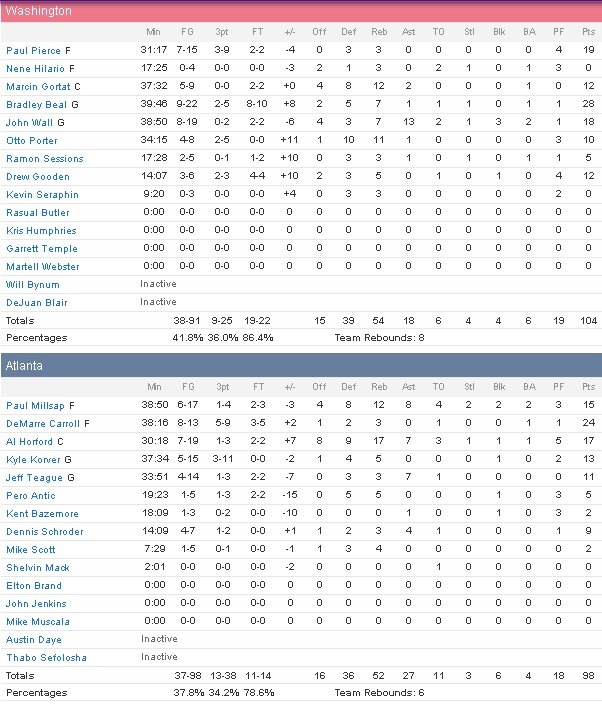 Ca a continué sur la même lancée pour les Hawks, qui ont dû attendre 5’30 avant de marquer leur premier panier du dernier quart. Résultat les Wizards ont pris les commandes pour la première fois depuis le premier quart avec un 8-0 sous l’impulsion de Beal, 88-83. Korver à trois points et Jeff Teague ont réduit le retard à une unité mais leur maladresse chronique leur a coûté cher et les Wizards ont refait rapidement le break sur un 7-1 avec deux jump shots de Pierce et Wall et un trois points de Porter. A 3 minutes de la fin les hommes de Randy Wittman comptaient une avance confortable avec un score de 98-91, mais ils se sont fait peur en cafouillant leur basket et en tentant des shoots compliqués. Sur deux actions en transition dont un And1, Millsap a relancé totalement la rencontre en recollant à 2 points à 1’21 de la fin. Washigton a alors géré parfaitement ses dernières possessions avec des paniers faciles de Porter et Gortat pour plier le match.