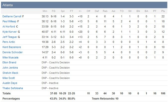 Ce dernier signe son 6e match consécutif à au moins 20 points, accompagné par les 18 points d’Al Horford et Paul Millsap (11 rebonds). Kyle Korver termine lui à 12 points (tous inscrits à 3-points) après avoir shooté à 1/7 en première mi-temps. Bradley Beal, qui jouait sur une entorse de la cheville droite, termine à 20 points (8/22, 5 rebonds et 7 passes), suivi par les 15 points de Paul Pierce et Otto Porter. Ramon Sessions, remplaçant de dernière minute à la mène, a lui fait un job admirable et termine meilleur marqueur avec 21 points à 8/14, 3 rebonds et 4 passes.