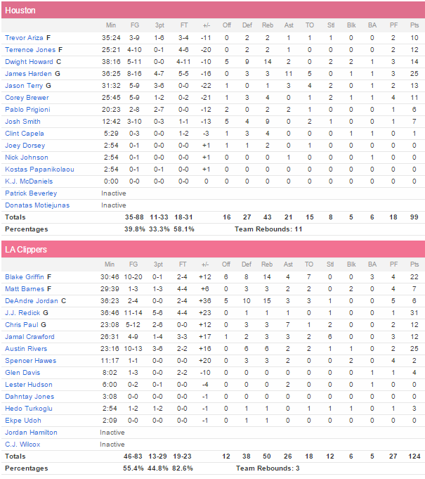 Rivers et Redick ont sorti le match de leur carrière, faisant voler en éclats la défense Texane avec respectivement 25 points à 10/13 dont 3/6 à trois points en 23 minutes et 31 points à 11/14 dont 5/6 à trois points en 37 minutes. Rivers a notamment connu une fin de troisième quart assez folle lors de laquelle les Clippers ont passé un 18-0 qui est même devenu un 23-0. Dans leur sillage les Clippers ont shooté à un excellent 55.4% aux tirs dont 13/29 à trois points. Blake Griffin continue sa bonne série avec 22 points à 10/20, 14 rebonds, 4 passes et 7 ballons perdus alors que Chris Paul n’a pas eu à se démener pour son retour mais il signe tout de même 12 points à 5/12 et 7 passes. A noter les 15 rebonds de DeAndre Jordan et les 12 points de Jamal Crawford.