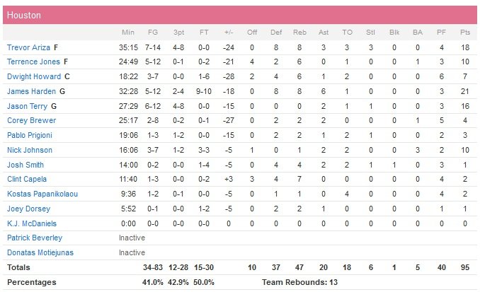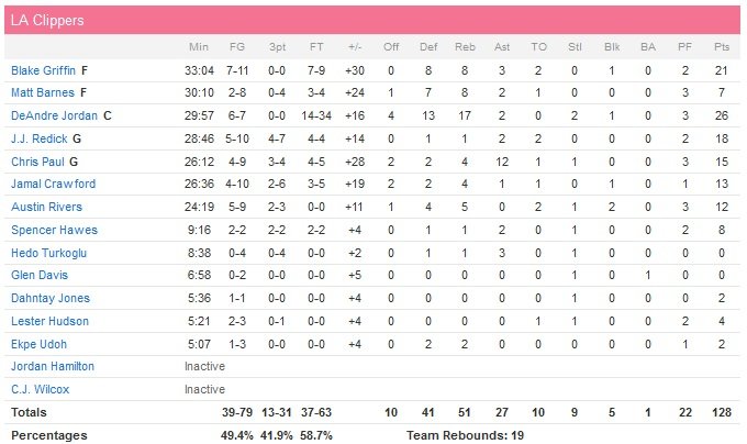 DeAndre Jordan s’est ainsi retrouvé 28 fois (!) sur la ligne (record NBA en playoffs) en première mi-temps (il termine à 10/28 à la mi-temps puis 14/34) et signe 26 points à 6/7 et 17 rebonds. Blake Griffin apporte lui 21 points à 7/11 8 rebonds et 3 passes, J.J. Redick 18 points et Chris Paul 15 points et 12 passes. Côté Rockets les feuilles de stats sont bien fades avec un James Harden à 21 points à 5/12, 8 rebonds et 6 passes et un Dwight Howard frustré par ses problèmes de fautes (il sera exclu à 9’52 de la fin du match) et limité à 7 points et 6 rebonds.
