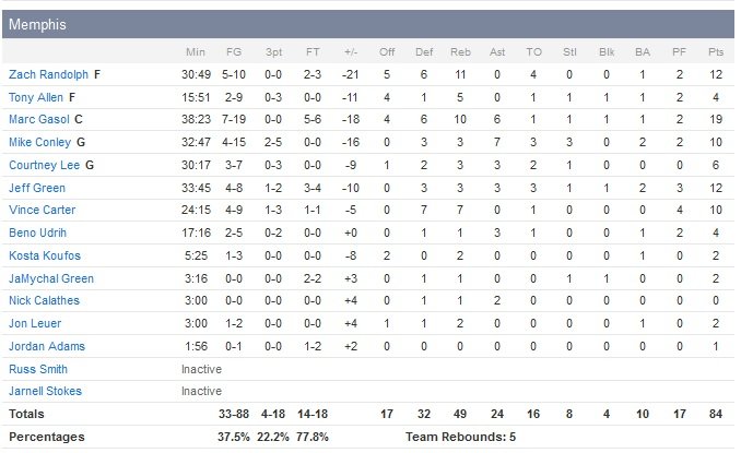 En retrait sur les matchs précédents, Stephen Curry (qui n’avait pas encore signé de matchs à plus de 23 points dans cette série) a cette fois parfaitement assumé son rôle de MVP et comptait déjà 21 de ses 33 points (11/22, 8 rebonds et 5 passes) à la mi-temps. Pour l’accompagner Draymond Green signe 16 points et 10 rebonds et Klay Thompson, Harrison Barnes et Andre Iguodala apportent respectivement 15, 12 et 11 points. Les tours jumelles voisines ont signé 19 points 10 rebonds et 6 passes (Marc Gasol) et 12 points et 11 rebonds (Zach Randolph) alors qu’à la mène Mike Conley termine à 10 points et 7 passes mais avec un pourcentage faible (4/15).