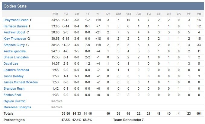 En retrait sur les matchs précédents, Stephen Curry (qui n’avait pas encore signé de matchs à plus de 23 points dans cette série) a cette fois parfaitement assumé son rôle de MVP et comptait déjà 21 de ses 33 points (11/22, 8 rebonds et 5 passes) à la mi-temps. Pour l’accompagner Draymond Green signe 16 points et 10 rebonds et Klay Thompson, Harrison Barnes et Andre Iguodala apportent respectivement 15, 12 et 11 points. Les tours jumelles voisines ont signé 19 points 10 rebonds et 6 passes (Marc Gasol) et 12 points et 11 rebonds (Zach Randolph) alors qu’à la mène Mike Conley termine à 10 points et 7 passes mais avec un pourcentage faible (4/15).