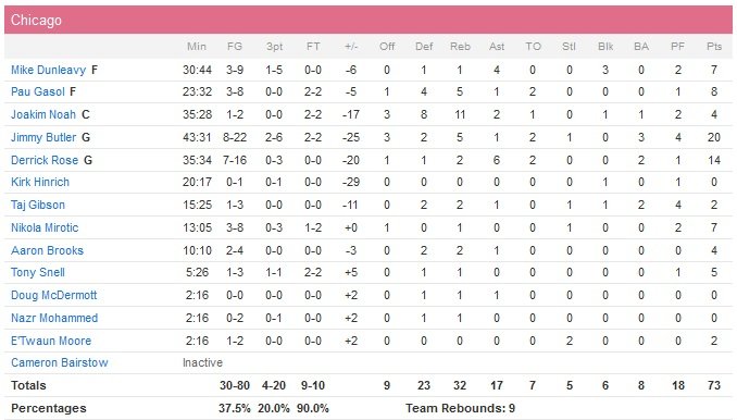 Limités à 37.5% de réussite et 4/20 à 3-points (contre 12/27 pour Cleveland et un 3/6 de loin pour James Jones, J.R. Smith et Dellavedova), les Bulls n’ont pas pu réellement profiter du retour de Pau Gasol, qui n’a joué que 23 minutes pour 8 points (tous inscrits dans le premier quart) à 3/8 et 5 rebonds. Derrick Rose n’a lui non plus pas été transcendant avec 14 points à 7/16 et 6 passes. Jimmy Butler s’en sort lui avec 20 points à 8/22 et 5 rebonds. Le premier quart-temps est disputé (33-31 Cleveland) et promet un match serré, Rose marque 10 points, Gasol 8 et Mike Dunleavy met dedans de loin. En face, la marque se répartie entre Tristan Thompson (9 points), Kyrie Irving (6 points) et Timofey Mozgov (7 points). Le score est de 35 partout lorsque Irving atterri sur le pied de Thompson à 9’47 de la mi-temps.