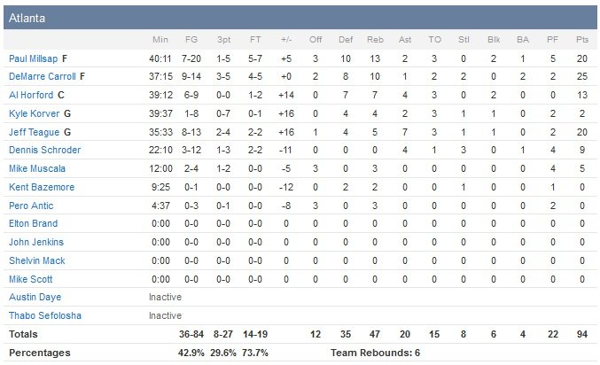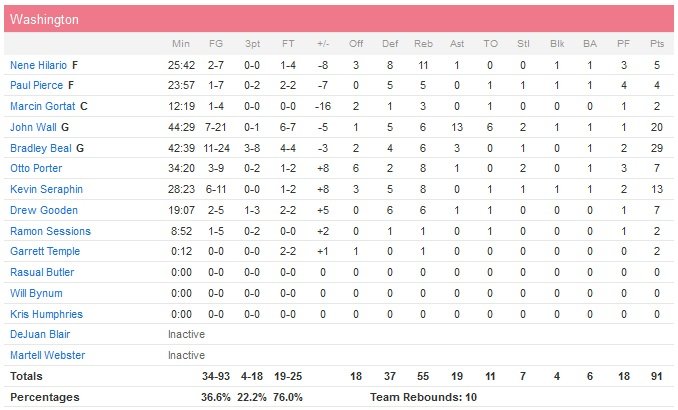 Paul Millsap ajoute 20 points à 7/20 dans ce match 6 alors que John Wall, qui a manqué trois matchs de la série (2, 3 et 4) pour de multiples fractures de la main gauche, remplit la feuille de stats mais manque également d’efficacité au niveau de son adresse avec 20 points à 7/21, 6 rebonds et 13 passes. Le meneur est accompagné par un bon Bradley Beal (29 points à 11/24, 6 rebonds 3 passes) mais le reste de l’équipe n’est tout simplement pas au niveau. À commencer par le frontcourt avec 5 points à 2/7 pour Nene (qui prend quand même 11 rebonds), 4 points à 1/7 pour Pierce et 2 points à 1/4 pour Marcin Gortat (malade). Kevin Seraphin s’en sort mieux avec 13 points à 6/11 et 8 rebonds en 28 minutes.