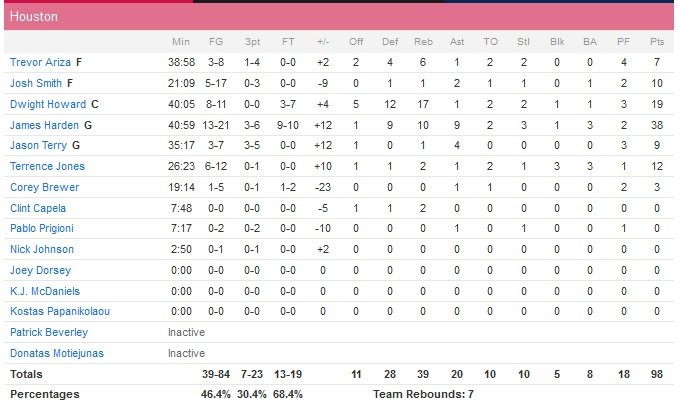 Curry donne de l’air à son équipe à son retour sur le terrain entre step backs et passes décisives. À 2’25 de la fin, les Warriors sont devant 96-89. Harden a réponse à tout, il enchaîne 6 points d’affilée et ramène doucement son équipe aux lancers-francs, 99-96. Houston force une violation des 8 secondes avant un alley oop d’Harden pour Howard qui réduit l’écart à un point 99-98 à 33 secondes du terme. La suite on la connaît et elle se termine avec un Harden effondré et allongé sur le terrain, les mains sur le visage. À noter : Stephen Curry est devenu le premier joueur à au moins 30 points et 5 passes sur ses deux premiers matchs de Finales de Conférence depuis un certain LeBron James en 2009.