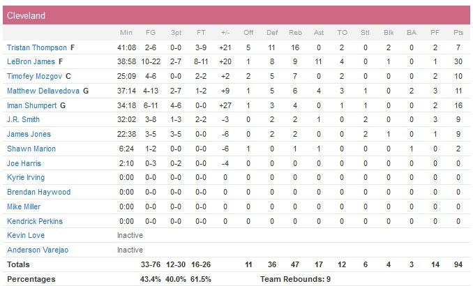 Le quatrième quart-temps (remporté 16 à 10 par les Hawks) se transforme en « garbage time » pour les deux équipes et à 93-74 alors qu’il reste 5 minutes à jouer, beaucoup de fans des Hawks se dirigent déjà vers la sortie. Cleveland aura l’occasion de prendre une option sur les Finales NBA (une équipe menant 2-0 a 94% de chances de remporter une série en 7 matchs) avec un 3-0 à la maison dimanche soir. À noter que James n’a besoin que de 17 points au prochain match pour prendre la 6e place de Karl Marlone au classement des meilleurs scoreurs de l’histoire en playoffs. Cette nuit il a déjà égalé Jerry West à la 4e place du classement des joueurs comptant le plus de matchs à au moins 30 points en playoffs (74).
