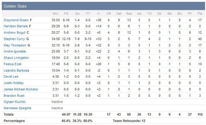 Après trois quarts-temps et sous les yeux de ses parents, le MVP en est à 37 points et obtient un repos mérité d’un peu plus de 5 minutes offert par Steve Kerr. Finalement, son 7e trois-points de la soirée termine d’achever les Rockets, 103-73. L’apport de Draymond Green a également été précieux pour Golden State avec 17 points à 8/16, 13 rebonds et 5 passes.