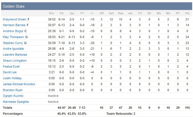 Victime d’une lourde chute en milieu de deuxième quart-temps, Stephen Curry n’a pu jouer que 30 minutes et termine à 23 points à 7/18 et 4 passes.