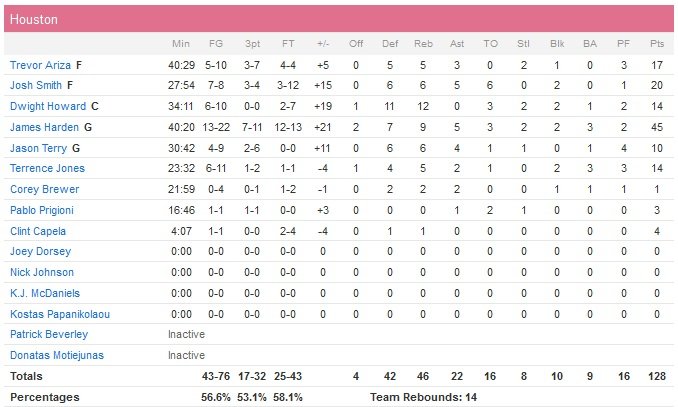 Rois du match à élimination directe (4V-0D dans ces playoffs), les Rockets ont sauvé leur peau avec la manière cette nuit. Ils ont assommé les Warriors dès l’entame avec un énorme premier quart-temps (45 points) et ont su maintenir leur avance tout au long du match. James Harden rend une copie majestueuse avec 45 points (record en playoffs) à 13/22, 9 rebonds et 5 passes et Houston force un match 5 grâce à un succès 128-115. Josh Smith ajoute 20 points à 7/8, 6 rebonds et 5 passes.