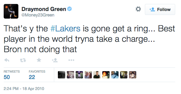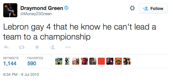 Draymond Green pourrait avoir quelques soucis pour d’anciens Tweets qui refont surface. Des Tweets datant de 2010 alors que le Warrior était encore à la fac. Certains sont d’un gout douteux et LeBron James était très souvent visé. A noter qu’il a déjà commencé à supprimer la plupart de ses tweets mais forcément c’était trop tard. En voici quelques uns