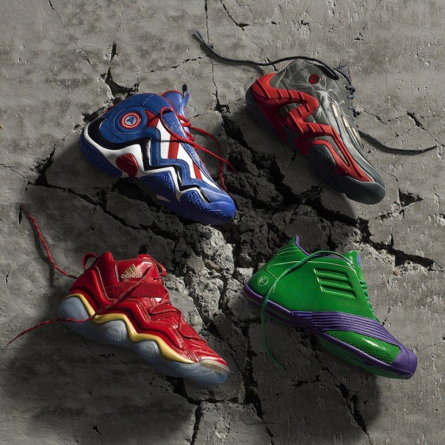 adidas se met aux super-héros avec cette collection Marvel Avengers composée de 4 modèles: Crazy 97 “Captain America”; T-Mac 1 “Hulk”; Top Ten 2000 “Iron Man” et Real Deal “Thor”