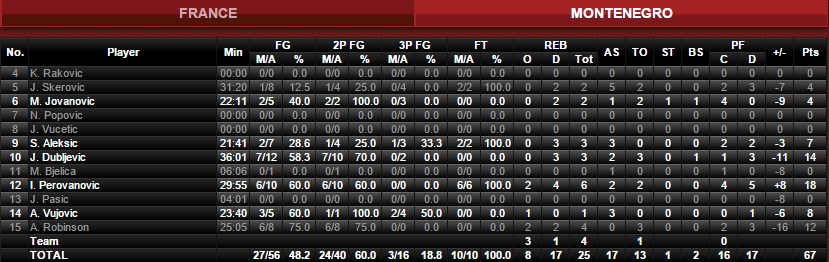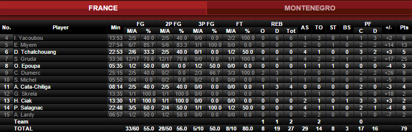 Pas à leur meilleur niveau depuis le début de la compétition, les bleues ont sorti leur meilleur match pour cette finale du groupe face au Monténégro. Dans le sillage d’une énorme Sandrine Gruda (25 points à 12/17, 8 rebonds et 4 passes) elles ont dominé leur adversaire 79-67 et terminent première du groupe (elles partiront avec deux victoires au second tour). Endy Miyem signe 13 points à 6/7 et Céline Dumerc 9 points, 5 rebonds, 7 passes et 3 interceptions.
