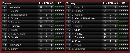 Le match va rester serré jusqu’en dans le money time. À 5 minutes de la fin du match, Gruda redonne un point d’avance à la France, 52-51. Diandra Tchatchouang manque la sanction lointaine après un ballon perdu de Sanders et les Turques se remettent en selle sur la ligne. Le match s’emballe lorsque Ciak sort pour 6 fautes. Sanders enchaîne un 2/2 et c’est Birsel Vardarli Demirmen qui porte un gros coup sur la tête des Bleues à 3-points après un échec de Dumerc, 60-52 Turquie à 1’58. Une minute plus tard la France est à -10 et ne pourra pas aller chercher le comeback.