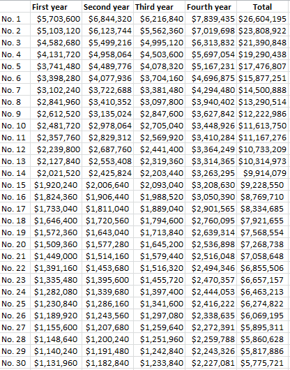 Etre drafté au premier tour est très important pour un joueur car cela lui assure de bénéficier d’un contrat garanti. Un contrat dont la valeur est fixée d’avance et voici donc ce que les 30 premiers joueurs vont toucher les prochaines années.