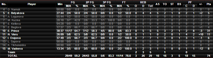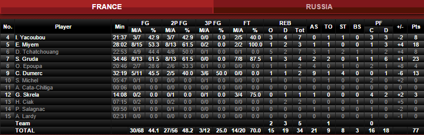 La jeune Vadeeva a inscrit les quatre premiers points du quart pour revenir à égalité mais les bleues ont bien réagi avec un 6-0 par l’intermédiaire de Yacoubou, Epoupa et Tchatchouang, 63-57 à 8 minutes de la fin. Empêtrées dans la bonne défense française, avec notamment le gros boulot d’Epoupa sur Prince, les Russes ont passé près de 5 minutes sans marquer le moindre point, et la France a enfoncé le clou par Dumerc et Miyem, plus 10 à moins de 5 minutes de la fin. Pas assez pour s’assurer une fin de match tranquille puisqu’un tir à trois points de Prince et une contre-attaque ont redonné espoir aux Russes à deux minutes de la fin, 71-66. Fébriles dans le money time les bleues ont aligné les pertes de balle et Prince les paniers. Sur un shoot à trois points elle a remis la Russie à égalité à 1 minute du buzzer. Après un nouveau ballon perdu, la France a finalement pu récupérer le ballon avec 34 secondes à jouer. Isabelle Yacoubou a été victime d’une faute anti-sportive et a inscrit le second lancer et derrière Gaël Skrela a rentré ses deux lancers francs pour un score de 74-71 avec la dernière possession pour la Russie. Osipova a rapidement réduit l’écart à un point mais dans la foulée Miyem a mis ses deux lancers pour assurer la victoire !