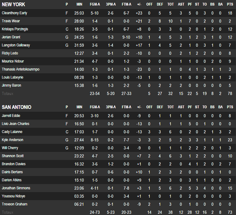 Côté Français Louis Labeyrie signe 2 points, 1 rebond, 1 passe et 1 contre en 8 minutes. Livio Jean-Charles 1 rebond et 1 passe en 16 minutes.
