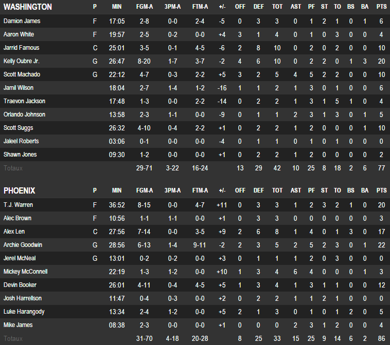 Bryce Cotton plante 28 points, Seth Curry 25 points, Kyle Anderson 23 points et Doug McDermott 20 points. Le trio des Suns Archie Goodwin (22 pts), Alex Len (17 pts) et TJ Warren (20 pts) a brillé alors que Devin Booker ajoute lui 12 points.