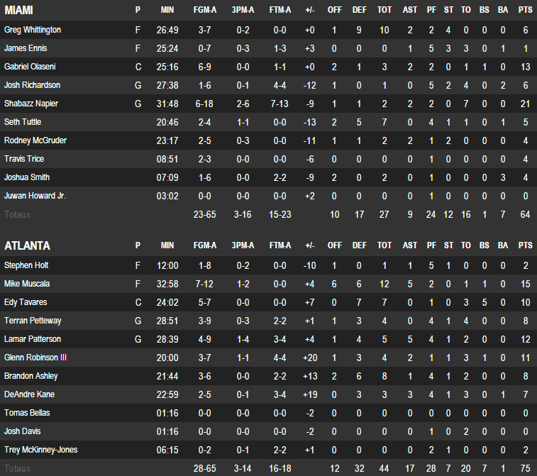 Brooklyn s'en sort mieux mais le Heat a perdu Reed, Johnson, Dragic et laisser Winslow partir aux ESPYs. C'est bien que Napier se dégourdissent les jambes mais ça reste la SL et en plus t'as Ennis qui est en train de se creuser un trou depuis Lundi.