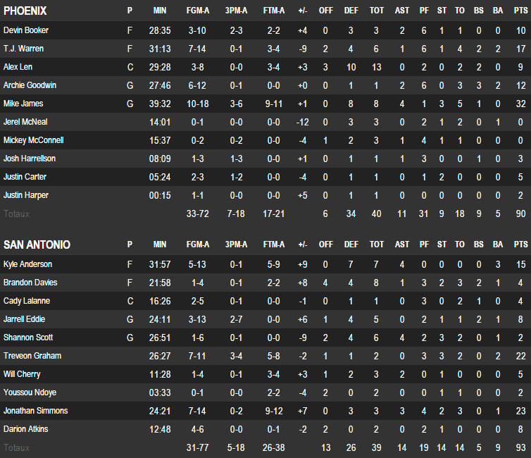 Les Suns avaient mieux débuté en menant 21-10 en fin de premier quart mais les hommes de Becky Hammon ont répondu par un 23-11 pour repasser devant et faire la course en tête en seconde mi-temps où ils ont compté jusqu’à 14 points d’avance. Côté Suns Mike James est le meilleur joueur avec 32 points à 10/18 dont 3/6 à trois points, 8 rebonds, 4 passes, 3 interception et 5 ballons perdus. TJ Warren ajoute 17 points, Archie Goodwin 12 et Devin Booker 10.