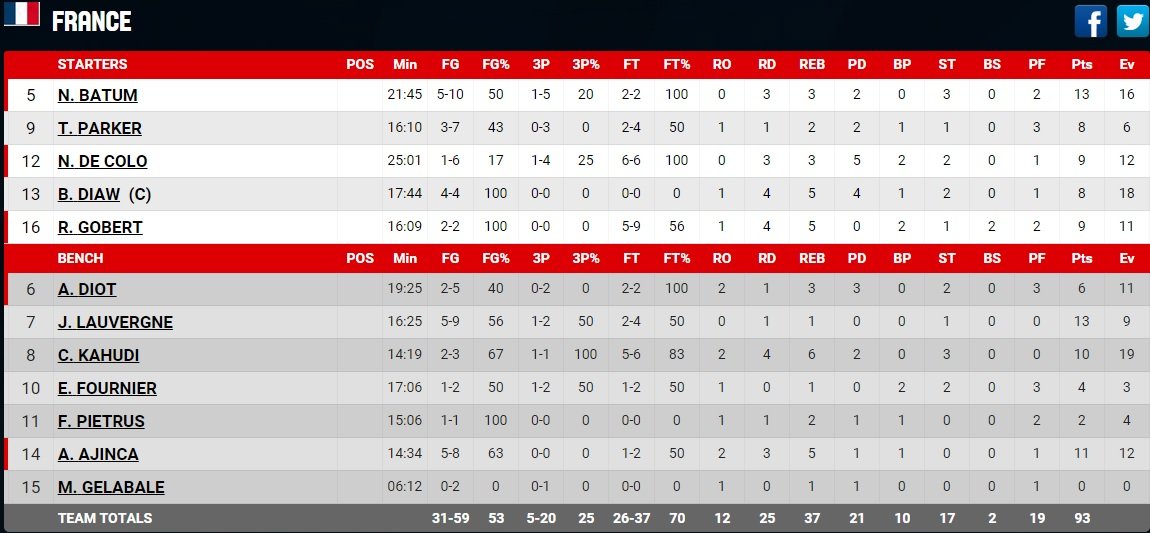 Joffrey Lauvergne et Nicolas Batum terminent meilleurs marqueurs avec 13 points. A noter l’excellent match De Charles Kahudi (10 points, 6 rebonds, 3 interceptions). Alexis Ajinça ajoute 11 points et 5 rebonds.