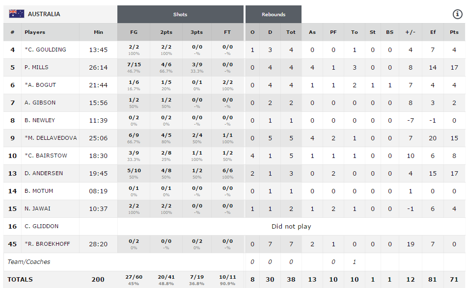 Aujourd’hui à Melbourne avait lieu la première manche pour le titre en Océanie entre l’Australie et la Nouvelle Zélande (le vainqueur sera directement qualifié pour les JO). Ce sont les Australiens qui se sont imposés 71-59 en menant une grande partie du match. Toutefois il a fallu un excellent dernier quart du duo Patty Mills et David Andersen pour aller chercher la victoire car à 3 minutes de la fin l’écart n’était que de 3 points. Mills a été l’homme du match avec 17 points à 7/15 en 26 minutes en sortie de banc, bien aidé par Matthew Dellavedova (15 points à 6/9) et le vétéran David Andersen (17 points).