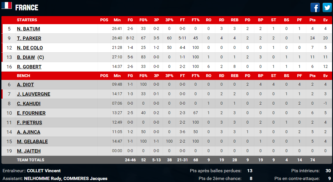 Evan Fournier a fait une entrée en jeu remarquée pour assurer la marque avec un 5 défensif, mais les Belges ont continué de faire la course en tête grâce à leur adresse extérieure. Le festival s’est poursuivi avec trois nouveaux trois points de suite, dont un avec la faute, pour un 11-0 qui a porté le score à 35-22. En manque d’agressivité, les bleus ont été un peu secoués lors d’un temps mort par Vincent Collet mais la réponse sur le terrain n’a pas vraiment été celle attendue puisque l’écart a continué d’augmenter, culminant à 14 points, 41-27. Laborieux en attaque face à la zone et en l’absence de Tony Parker, économisé par Vincent Collet en second quart, la France est tout de même passée sous les 10 points à la pause 41-32. Trois stats en disaient long sur la première mi-temps: les 8 ballons perdus pour seulement 5 passes des bleus et le 9/16 à trois points de la Belgique.