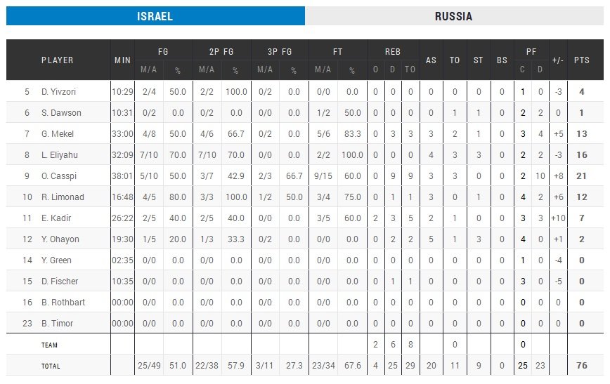 Casspi continue son festival face à une équipe russe qui semble tétanisée alors que Lior Eliyahu poursuit le travail entamé par son coéquipier. Seulement la Russie (11/29 à 3-points) n’a pas dit son dernier mot et passe un 9-2 lancé par Andreï Vorontsevitch pour recoller à 67-64 alors que son équipe comptait encore 10 points de retard deux minutes plus tôt. Dmitri Khvostov maintient la pression jusqu’au bout avec deux 3-points ultra-clutchs. Alors qu’il reste 4 secondes, Gal Mekel rate son premier lancer, rentre le deuxième et Israël reste devant 75-72. Israël s’en sort finalement in extremis au petit jeu des lancers-francs.