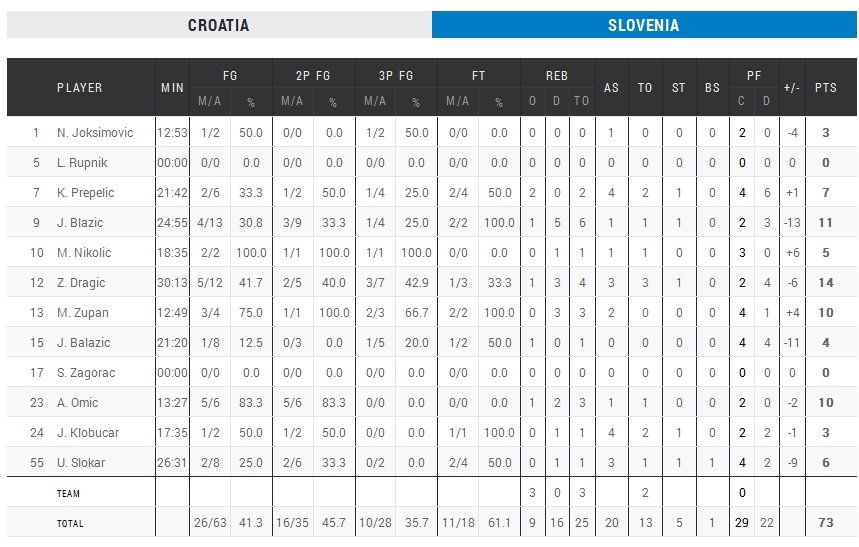 Devant leur public de Zagreb, les Croates n’ont pas loupé le coche ce soir contre la Slovénie. Ils l’emportent 80-73 grâce notamment aux 20 points de Krunoslav Simon, 17 de Luka Zoric et 13 de Mario Hezonja. Les Slovènes ont résisté un temps grâce à leur adresse extérieure avant de rendre les armes (10/28 sur le match contre 6/16 pour la Croatie), totalement dominés au rebond (25 prises à 43 en faveur des locaux).