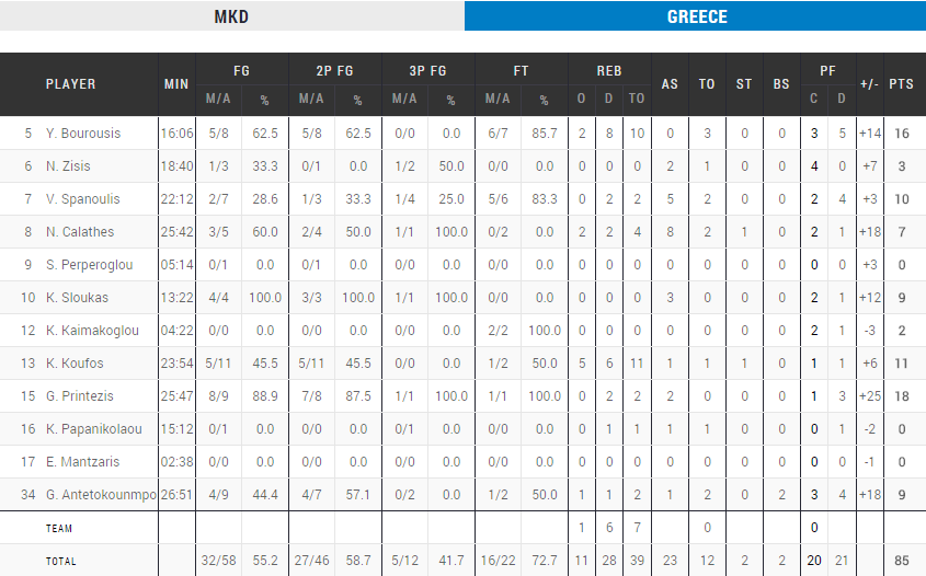 La Macédoine a été la première équipe en action en débutant par un 7-1 mais la suite du quart a été totalement à l’avantage de la Grèce, qui a resserré sa défense et répondu par un cinglant 18-2 dans le sillage du trio Calathes, Antetokounmpo, Printezis. Après un quart la Grèce était logiquement devant 23-17. Toutefois la Macédoine s’est bien accrochée grâce à son duo Kostoski, Stojanovski, qui ont aligné trois tirs à trois points en début de second quart pour revenir à un petit point. La Grèce a de nouveau mis un coup d’accélérateur avec un 10-3 pour reprendre un peu d’air 38-31 à la pause. A noter que dans ce second quart la Macédoine a marqué ses 15 points sur des tirs derrière l’arc.