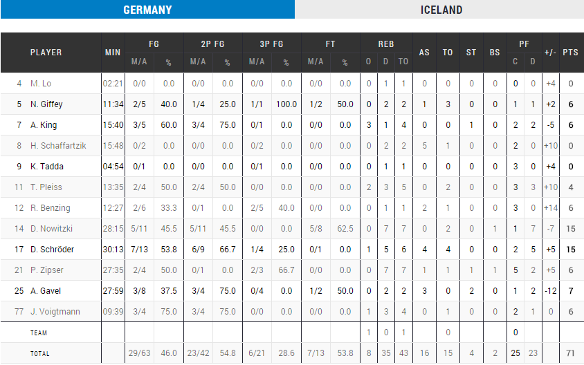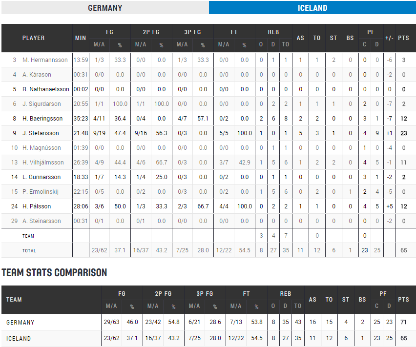 L’Allemagne a pris jusqu’à 18 points d’avance après la pause mais l’Islande n’a pas abdiqué en restant à une dizaine de points en faisant jeu égal sur le quart. Alors qu’on pensait l’Allemagne se diriger vers une fin de rencontre tranquille avec un score de 61-43 puis 69-56 à 4’40 de la fin, l’Islande a pris feux en alignant 3 tirs à trois points de suite pour recoller à 6 points à 2’50 de la fin. Maladroits ensuite, ils n’ont pas pu inquiéter plus les locaux.