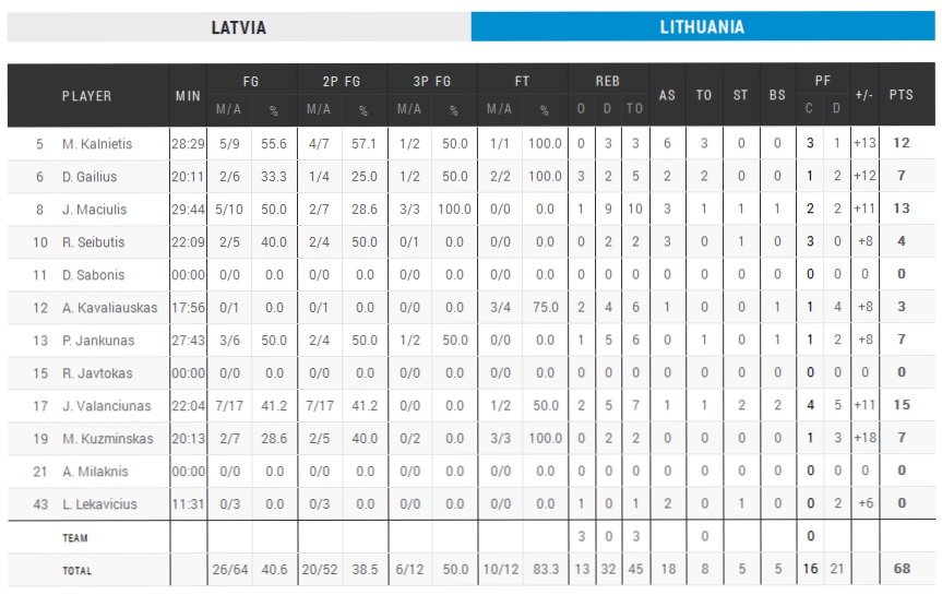 Après une première victoire laborieuse face à l’Ukraine hier (69-68), la Lituanie s’est bien rattrapée avec un deuxième succès en autant de matchs cette fois contre la Lettonie (68-49), qui jouait encore une fois à domicile (Riga) et qui avait pourtant fait bonne impression face à la Belgique hier (78-67). Malgré un pourcentage discutable (7/17), Jonas Valanciunas termine meilleur marqueur des siens avec 15 points. Son compatriote Jonas Maciulis signe lui un double-double avec 13 points 10 rebonds et 3 passes en 29 minutes de jeu.
