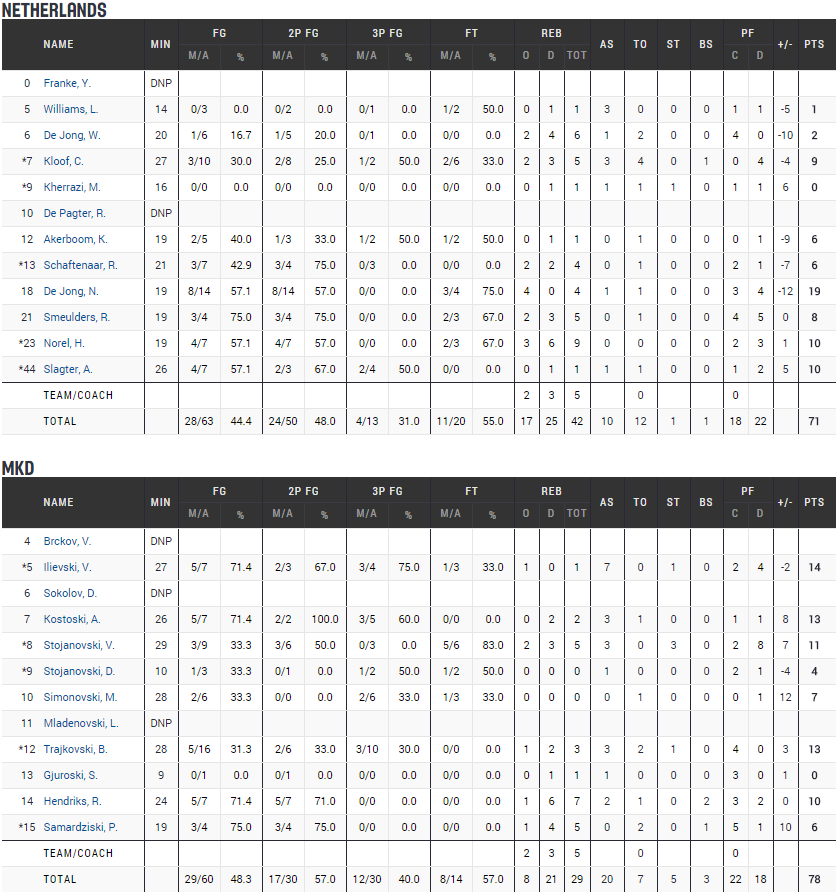 Dans une rencontre très importante en vue de la qualification pour les 8ème de finale, la Macédoine a dominé les Pays-Bas 78-71 dans le sillage du trio Richard Hendriks (10 points, 7 rebonds), Aleksandar Kotoski (13 points à 5/7) et Vlado Ilevski (14 points à 5/7).